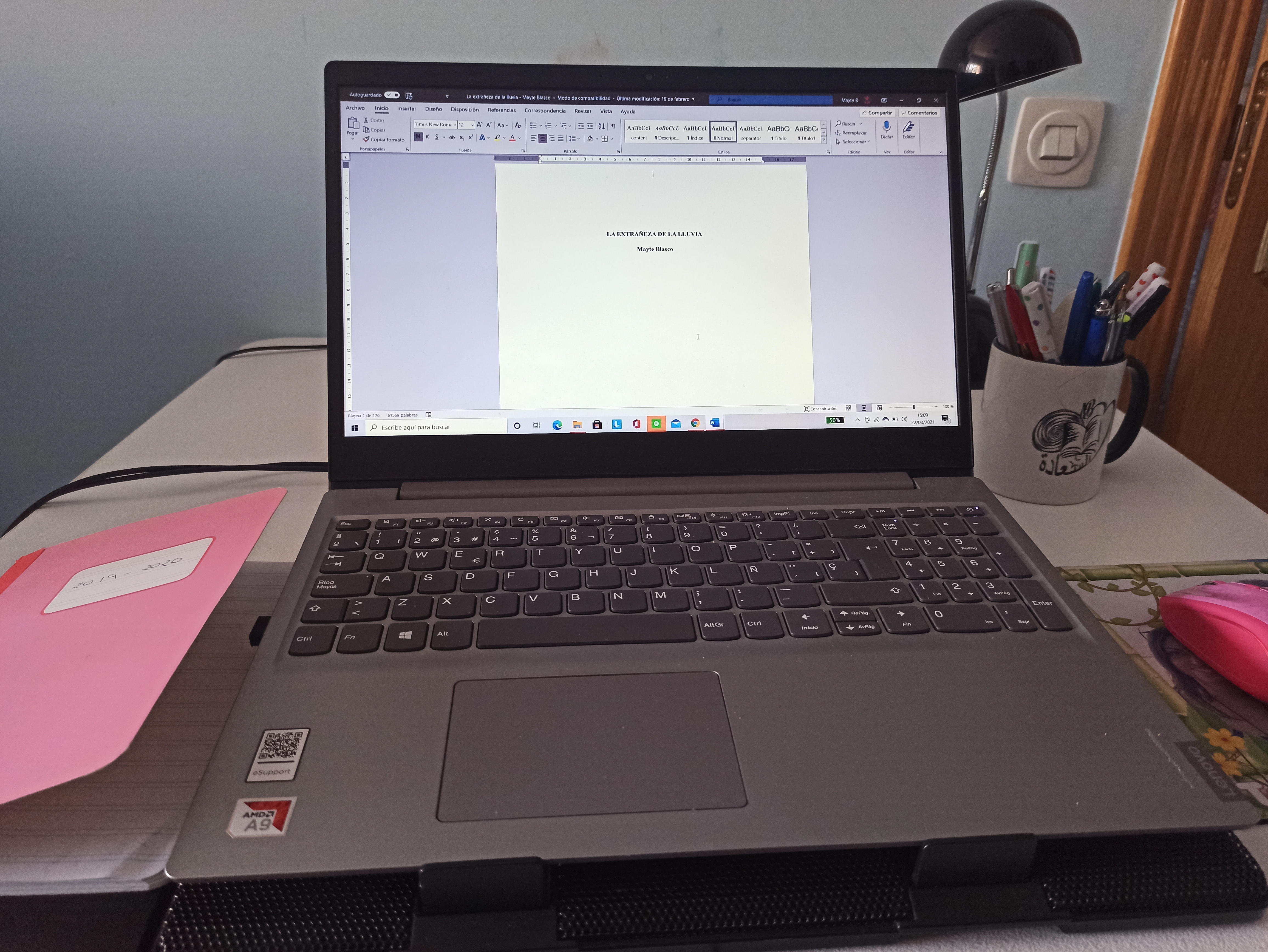Nota: Había pensado decorar esta entrada con una de esas fotos perfectas de escritorios amplios con jarrones de flores y vistas al mar, pero luego he pensado que sería más auténtico publicar una imagen del verdadero espacio donde escribo (o, mejor dicho, uno de ellos, ya que soy una escritora errante que se va adaptando a las no siempre favorables posibilidades del entorno y a la convivencia familiar).